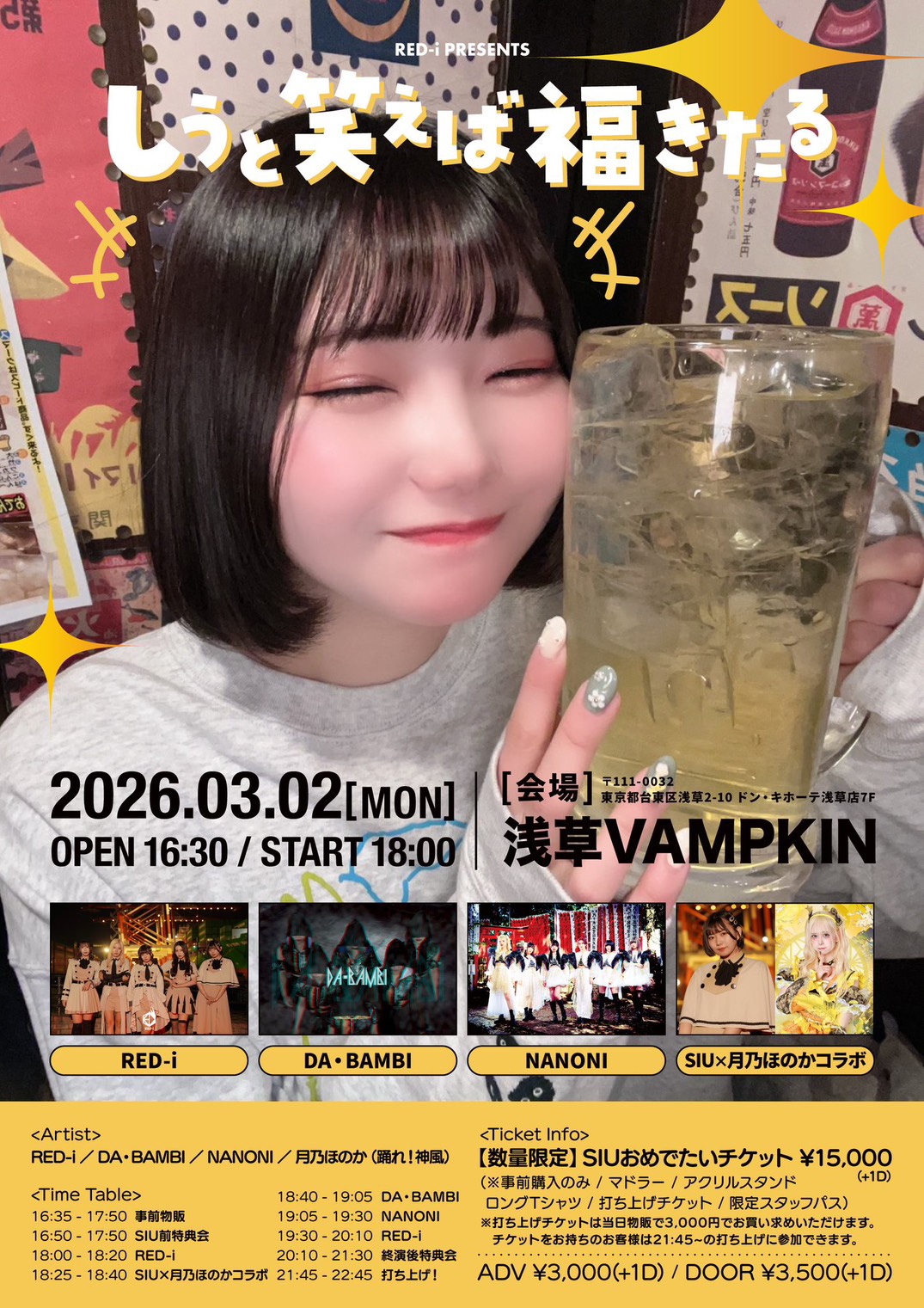 03.02(Mon) RED-i presents SIU生誕祭 〜しうと笑えば福来たる〜 浅草VAMPKIN X Facebook LINE コピー 2026.02.18 ACT RED-i、DA・BANBI、NANONI、月乃ほのか×SIUコラボステージ イベント詳細 浅草 VAMPKINベースオントップグループのライブハウス『浅草 VAMPKIN(アサクサ ヴァンプキン)』東京浅草にあるライブハウスです。