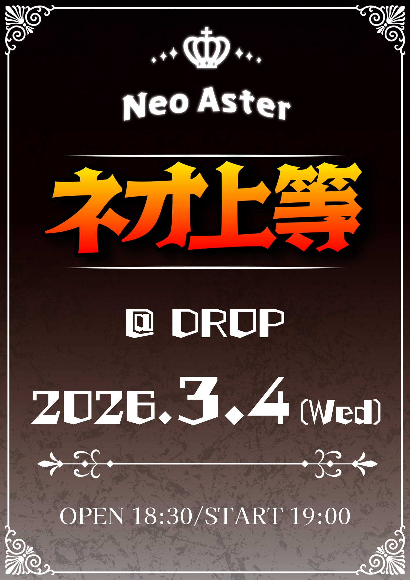 03.04(Wed) ネオ上等-vol2- アメリカ村DROP X Facebook LINE コピー 2026.02.19 ACT NeoAster イベント詳細 アメリカ村 DROP(ドロップ)|大阪 心斎橋アメ村のライブハウスベースオントップグループのライブハウス『アメリカ村 DROP(ドロップ)』大阪アメリカ村の中心地にあるライブハウスです。