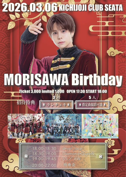 03.06(Fri) もりさわ生誕2部 吉祥寺 CLUB SEATA X Facebook LINE コピー 2026.02.20 ACT もりさわ生誕2部 イベント詳細 吉祥寺CLUB SEATA|東京 吉祥寺のライブハウス吉祥寺駅から徒歩5分、西東京最大級のライブハウス/CLUB!誰もが想像し得なかった吉祥寺という場所に新たなプレイスポットが誕生!都内のライブシーン・クラブシーンに新たな風を創るCLUB SEATA
