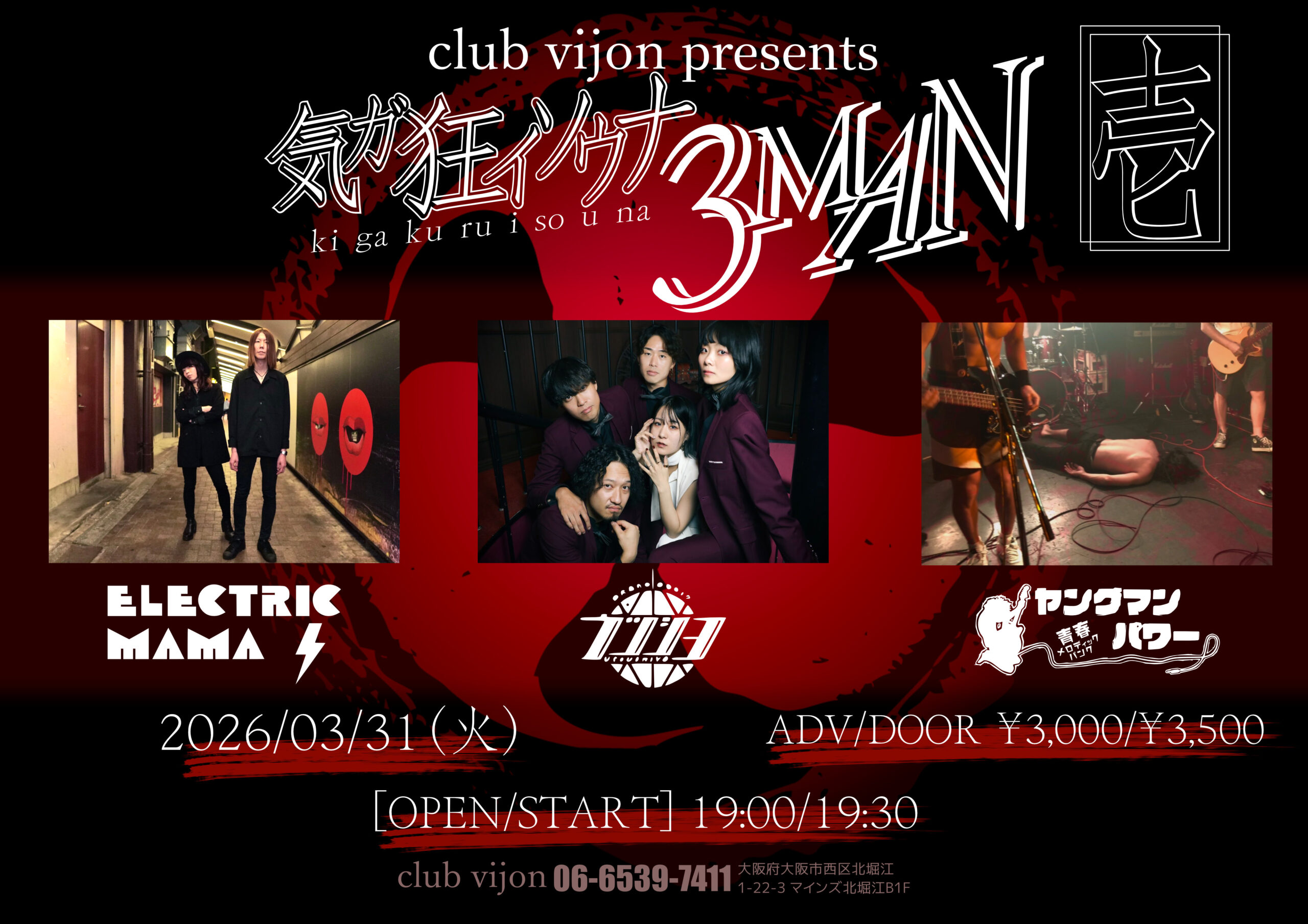 03.31(Tue) 【気ガ狂イソウナ3MAN 壱】【配信あり】 北堀江 club vijon X Facebook LINE コピー 2026.02.26 ACT ELECTRIC MAMA / ウツシヨ / ヤングマンパワー イベント詳細 北堀江 club vijon(クラブビジョン)|大阪 北堀江のライブハウスベースオントップグループのライブハウス『北堀江club vijon』大阪北堀江にあるライブハウスです。