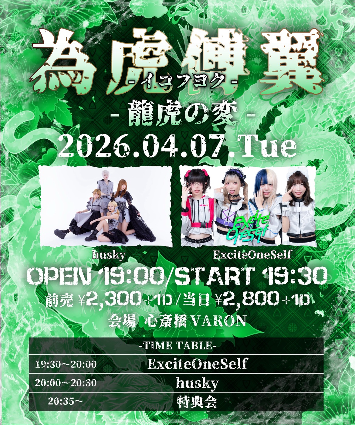 04.07(Tue) 為虎傅翼ーイコフヨクー 龍虎の変(ExciteOneSelf) 心斎橋VARON X Facebook LINE コピー 2026.03.03 ACT husky / ExciteOneSelf イベント詳細 心斎橋 VARON(ヴァロン)|大阪 心斎橋のライブハウス大阪にあるライブハウス「心斎橋VARON」アーティストのパフォーマンスを最大限に引き出すことをコンセプトにしたステージ・音響・照明。ジャンルや形態を超え、様々なイベントに完全対応いたします。音楽スタジオベースオントップ併設。