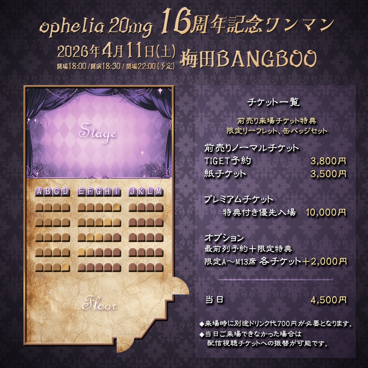 04.11(Sat) ophelia 20mg 16周年記念ワンマン 「魔女の展覧会」【配信あり】 梅田BANGBOO X Facebook LINE コピー 2026.03.03 ACT VOCAL:ophelia 20mg DJ:SLF!! VIOLIN:瞬 月凌 ACT:梶原くみ/ジョン・ムハンマド イベント詳細 梅田 BANGBOOベースオントップグループのライブハウス『梅田 BANGBOO(ウメダバンブー)』大阪梅田にあるライブハウスです。