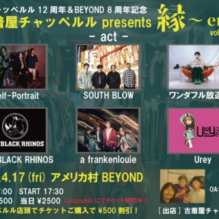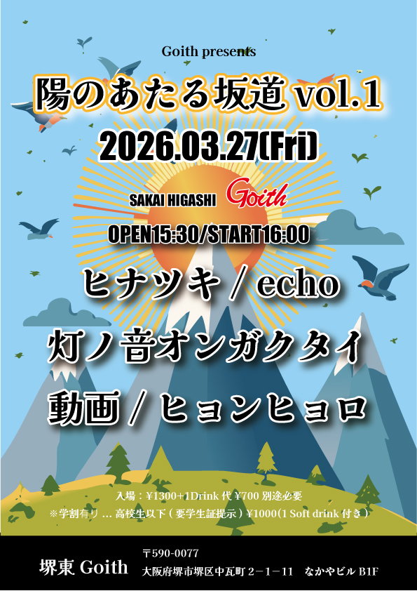 03.27(Fri) 堺東Goith presents 陽のあたる坂道 vol.1 堺東Goith X Facebook LINE コピー 2026.03.04 ACT ヒナツキ / echo / 灯ノ音オンガクタイ / 動画 / ヒョンヒョロ イベント詳細 堺東 Goith(ゴイス)|大阪 堺東のライブハウスベースオントップグループのライブハウス『堺東Goith』南海高野線の堺東からすぐの、粋なライブハウスです。