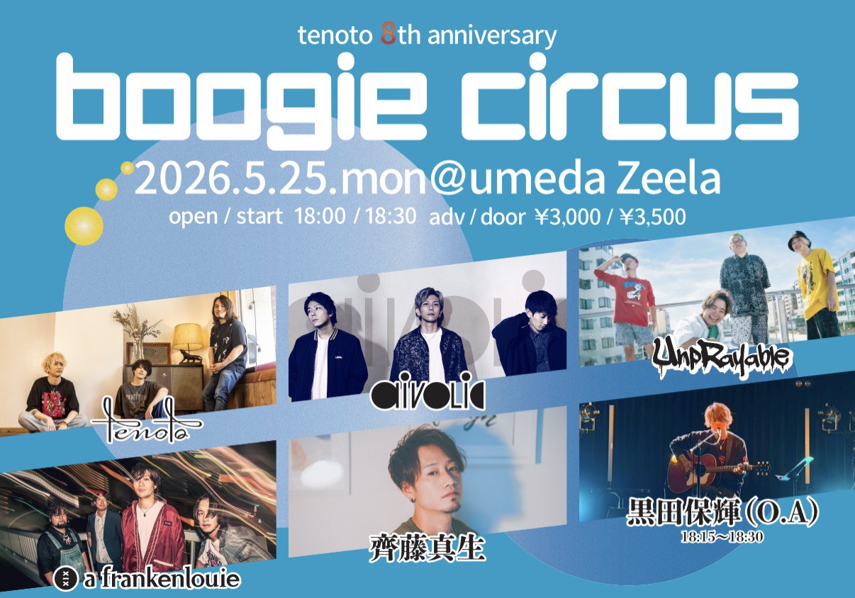 05.25(Mon) tenoto 8th anniversary [ boogie circus ] 梅田Zeela X Facebook LINE コピー 2026.03.05 ACT tenoto / aivolic / UnpRayable / a frankenlouie / 齊藤真生 / 黒田保輝(O.A) イベント詳細 梅田 Zeela|大阪 梅田のライブハウス大阪梅田のライブハウス Zeela(ジーラ)!ベースオントップグループ8軒目となるライブハウスです。