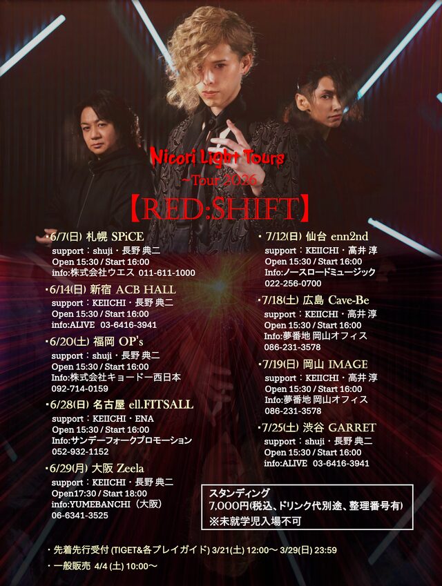 06.29(Mon) ~Tour 2026~ 『RED:SHIFT』 梅田Zeela X Facebook LINE コピー 2026.03.05 ACT Nicori Light Tours <サポートメンバー> 長野典二(Bass) / KEIICHI(Drum) イベント詳細 梅田 Zeela|大阪 梅田のライブハウス大阪梅田のライブハウス Zeela(ジーラ)!ベースオントップグループ8軒目となるライブハウスです。