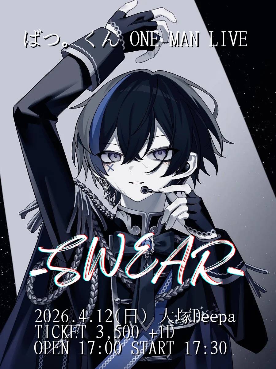 04.12(Sun) ばつ。くん ONE-MAN LIVE -SWEAR- 大塚Deepa X Facebook LINE コピー 2026.03.05 ACT ・演者 ばつ。くん ・スペシャルゲスト 暁葉、くろむ、みづきくん。、らいか(Ba.) イベント詳細 大塚Deepa|東京 大塚のライブハウスベースオントップグループのライブハウス『大塚Deepa』東京山手線大塚駅徒歩1分!!にあるライブハウス/クラブです。
