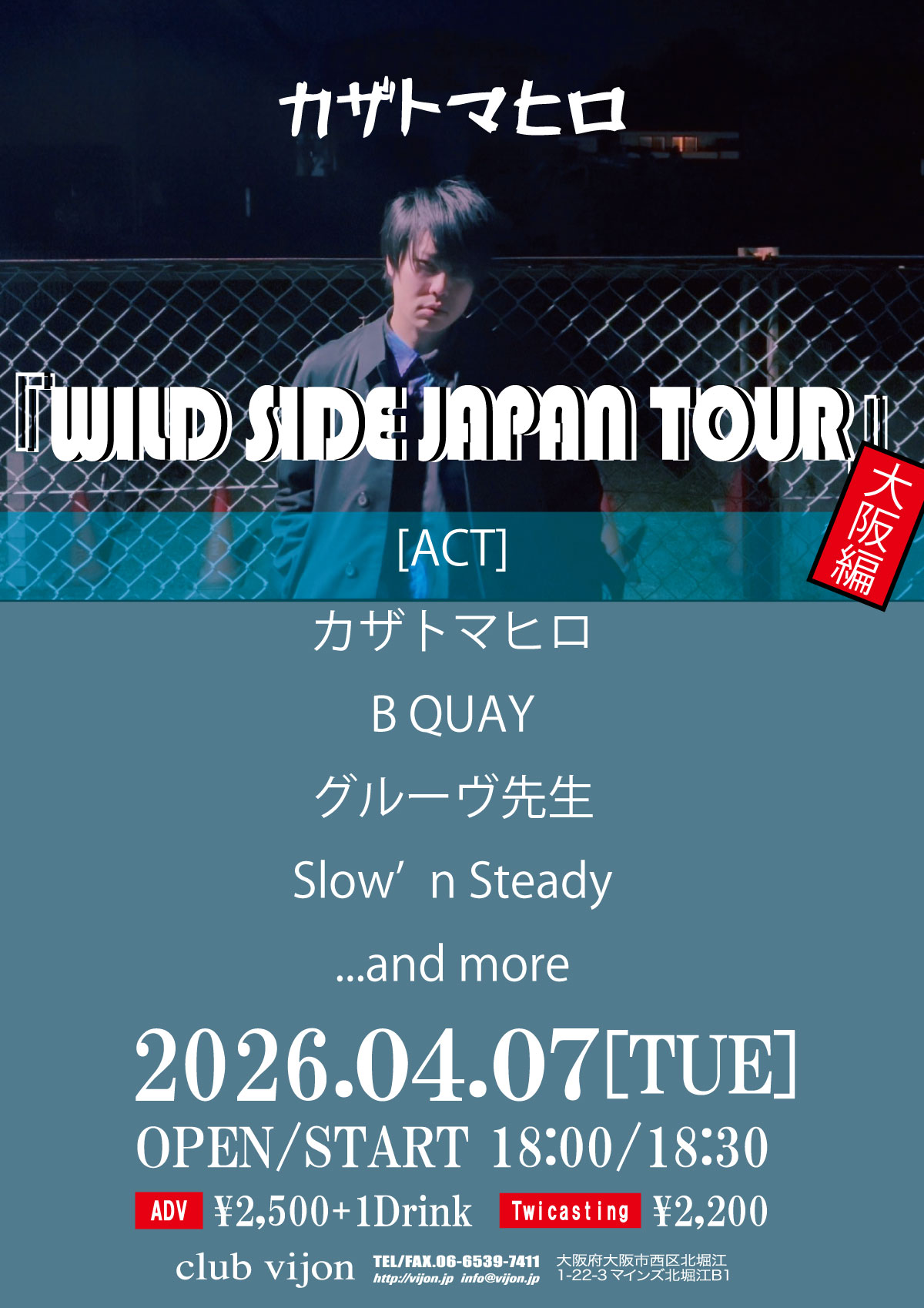04.07(Tue) カザトマヒロ『WILD SIDE JAPAN TOUR』大阪編【配信あり】 北堀江 club vijon X Facebook LINE コピー 2026.03.08 ACT カザトマヒロ / B QUAY / グルーヴ先生 / Slow’n Steady / …and more イベント詳細 北堀江 club vijon(クラブビジョン)|大阪 北堀江のライブハウスベースオントップグループのライブハウス『北堀江club vijon』大阪北堀江にあるライブハウスです。