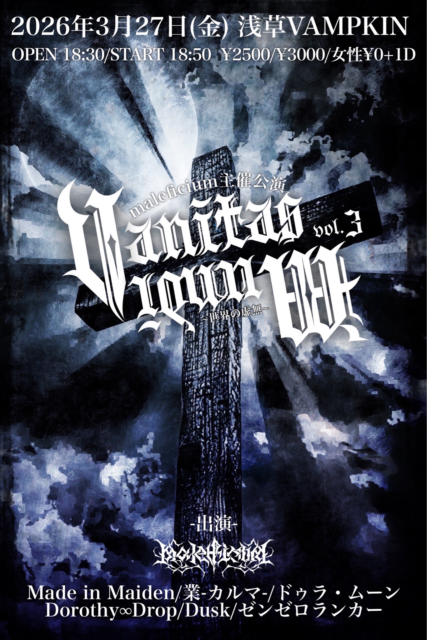 03.27(Fri) maleficium主催公演 Vanitas Mundi (ヴァニタス・ムンディ)〜世界の虚無〜Vol.3 浅草VAMPKIN X Facebook LINE コピー 2026.03.09 ACT maleficium、Made in Maiden、 業-カルマ-、ドゥラ・ムーン、Dorothy∞Drop、Dusk、ゼンゼロランカー イベント詳細 浅草 VAMPKINベースオントップグループのライブハウス『浅草 VAMPKIN(アサクサ ヴァンプキン)』東京浅草にあるライブハウスです。