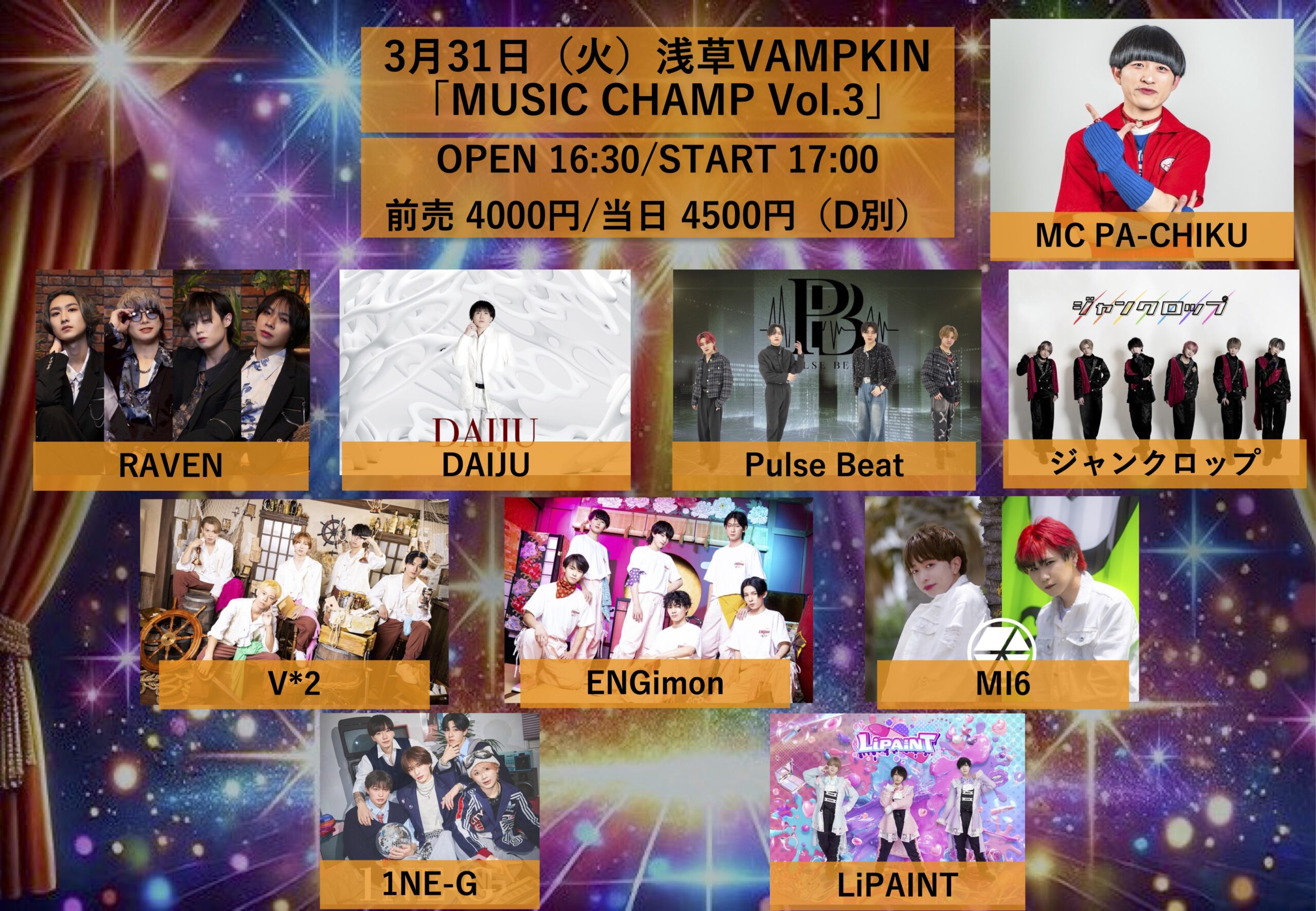 03.31(Tue) 「MUSIC CHAMP Vol.3」 浅草VAMPKIN X Facebook LINE コピー 2026.03.09 ACT DAIJU/Pulse Beat/1NE-G/LiPAINT/ジャンクロップ/MI6/V*2/ENGimon/RAVEN MC PA-CHIKU イベント詳細 浅草 VAMPKINベースオントップグループのライブハウス『浅草 VAMPKIN(アサクサ ヴァンプキン)』東京浅草にあるライブハウスです。