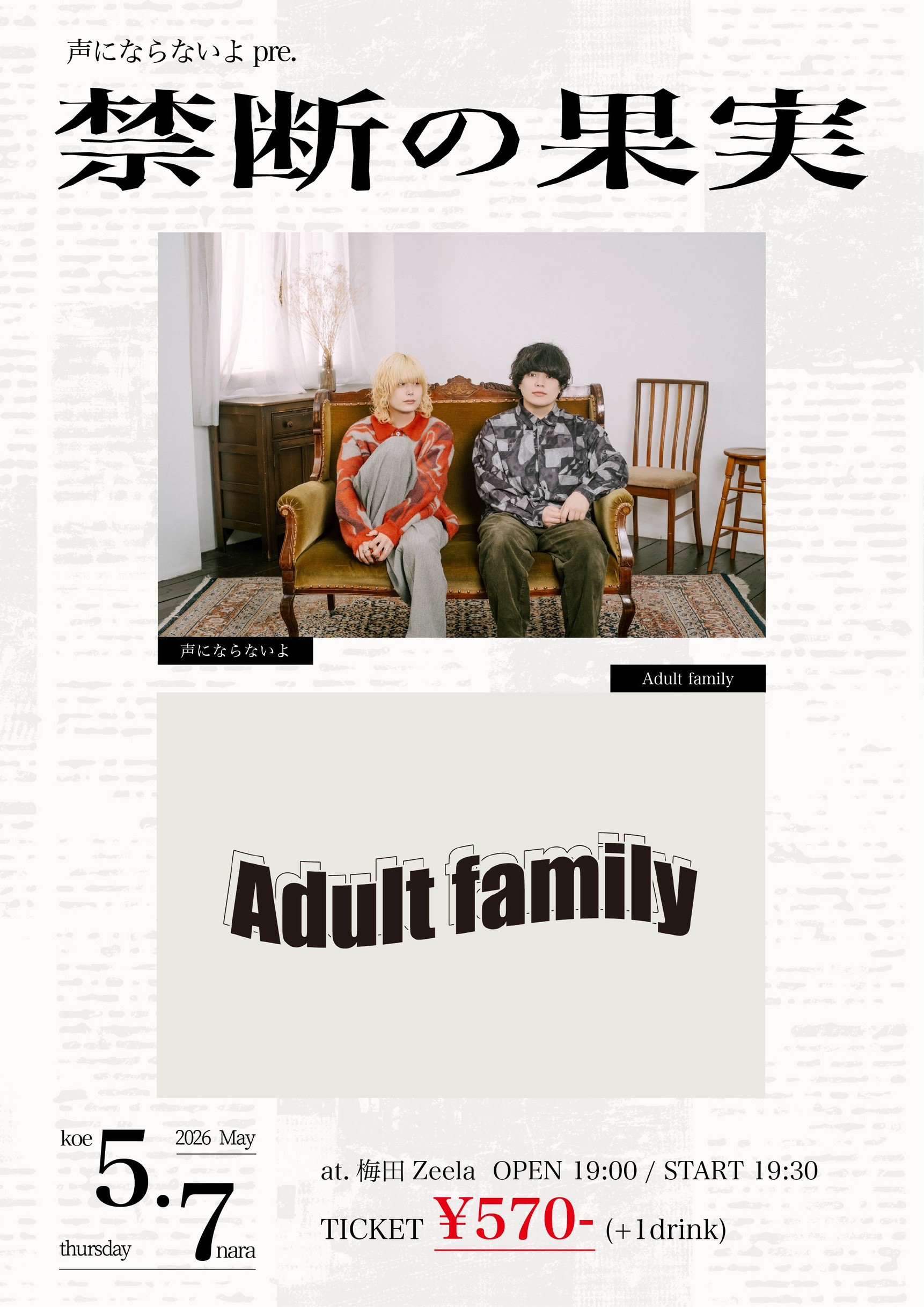 05.07(Thu) 声ならの日ファン大感謝祭-禁断の果実- 梅田Zeela X Facebook LINE コピー 2026.03.09 ACT 声にならないよ / Adult family イベント詳細 梅田 Zeela|大阪 梅田のライブハウス大阪梅田のライブハウス Zeela(ジーラ)!ベースオントップグループ8軒目となるライブハウスです。
