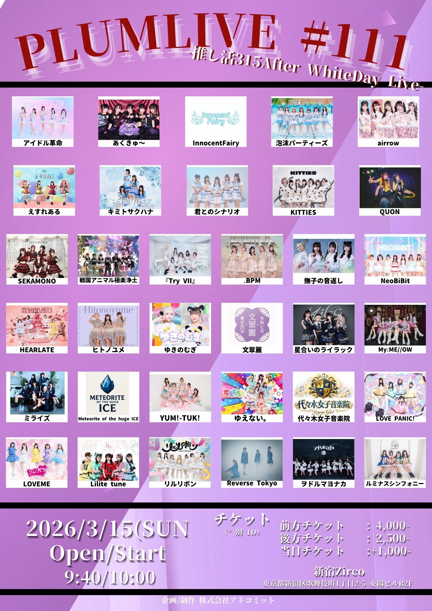 泡沫パーティーズ/LOVEME/airrow/HEARLATE/戦国アニマル極楽浄土/ヲドルマヨナカ/Meteorite of the huge ICE/Lilite tune/SEKAMONO/LOVE PANIC!/星合いのライラック/撫子の音返し/ミライズ/リルリボン/『Try VII』/InnocentFairy/代々木女子音楽院/ヒトノユメ/えすれある/ゆえない。/KITTIES/文翠麗/キミトサクハナ/NeoBiBit/.BPM/YUM!-TUK!/君とのシナリオ/My:ME//OW/あくきゅ〜/アイドル革命/Reverse Tokyo/QUON/追加:ルミナスシンフォニー/ゆきのむぎ