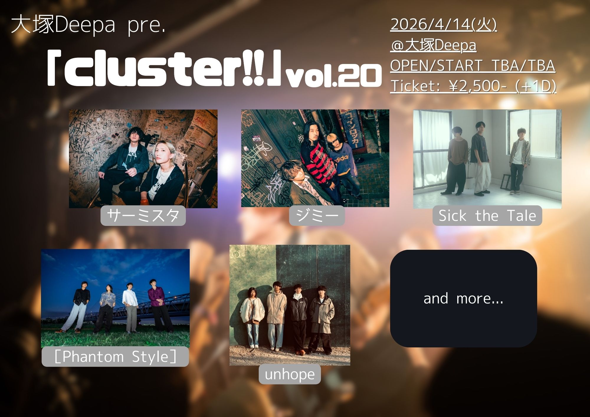 04.14(Tue) 大塚Deepa pre.「cluster!!」vol.20 大塚Deepa X Facebook LINE コピー 2026.03.11 ACT サーミスタ/ジミー/Sick the Tale/[Phantom Style]/unhope/and more… イベント詳細 大塚Deepa|東京 大塚のライブハウスベースオントップグループのライブハウス『大塚Deepa』東京山手線大塚駅徒歩1分!!にあるライブハウス/クラブです。