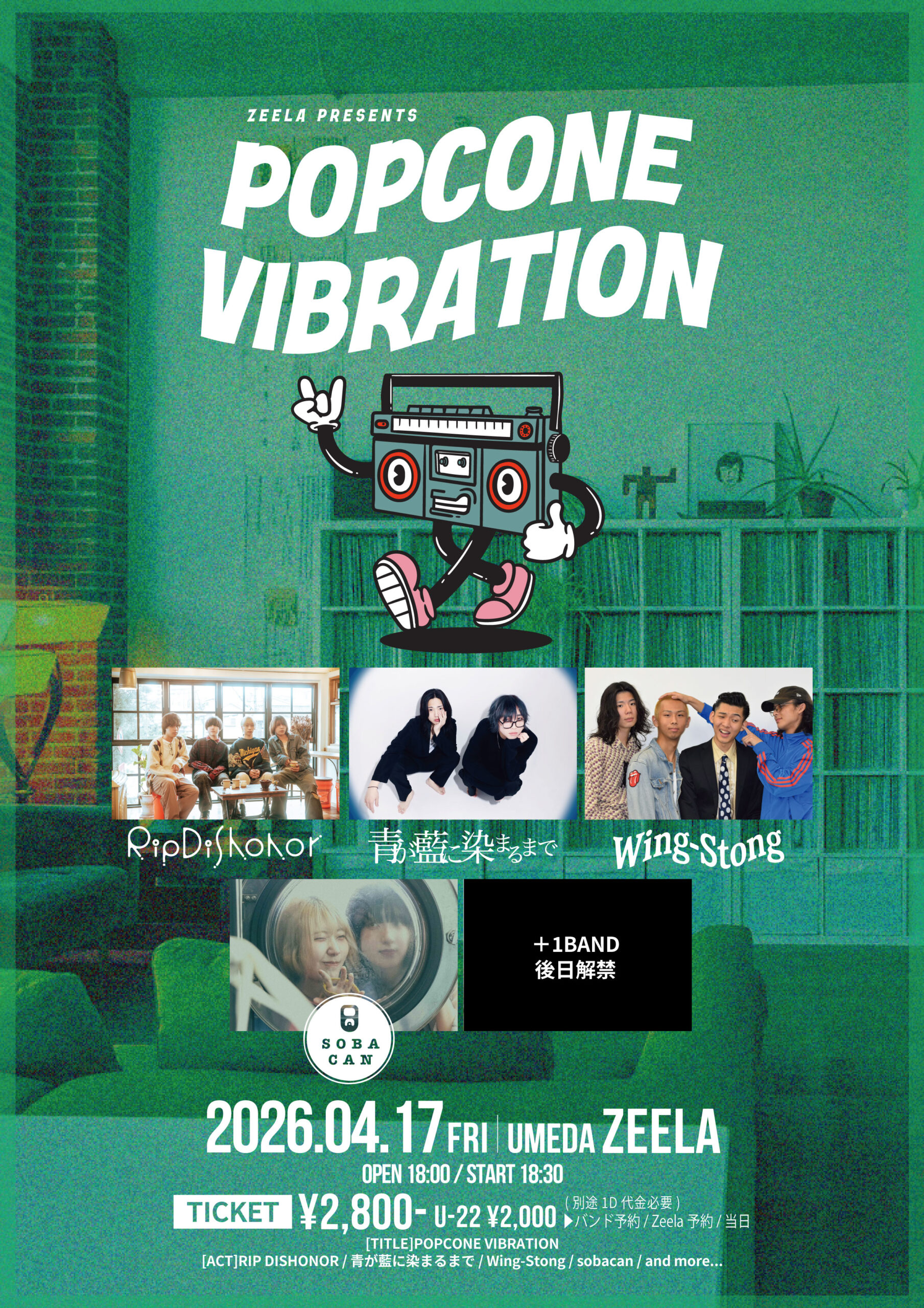 04.17(Fri) Zeela presents POPCONE VIBRATION 梅田Zeela X Facebook LINE コピー 2026.03.14 ACT RIP DISHONOR / 青が藍に染まるまで / Wing-Stong / sobacan / +1BAND(3/17解禁) イベント詳細 梅田 Zeela|大阪 梅田のライブハウス大阪梅田のライブハウス Zeela(ジーラ)!ベースオントップグループ8軒目となるライブハウスです。