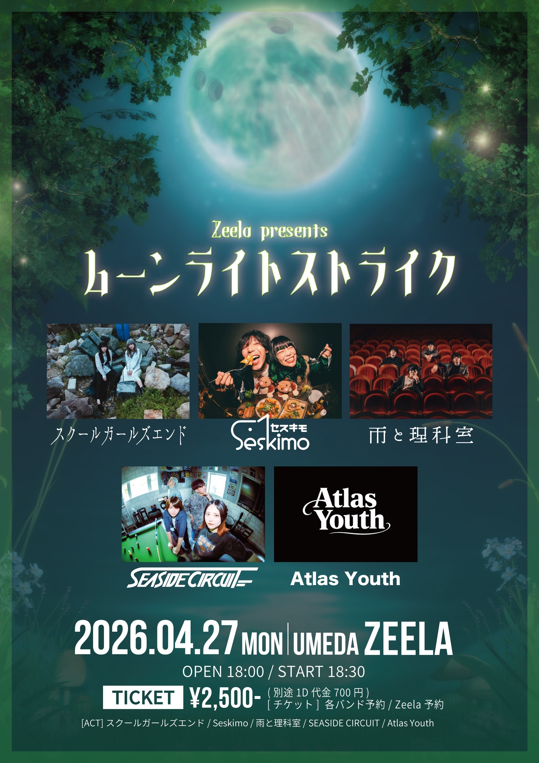 04.27(Mon) Zeela presents “ムーンライトストライク” 梅田Zeela X Facebook LINE コピー 2026.03.14 ACT スクールガールズエンド / Seskimo / 雨と理科室 / SEASIDE CIRCUIT / Atlas Youth イベント詳細 梅田 Zeela|大阪 梅田のライブハウス大阪梅田のライブハウス Zeela(ジーラ)!ベースオントップグループ8軒目となるライブハウスです。