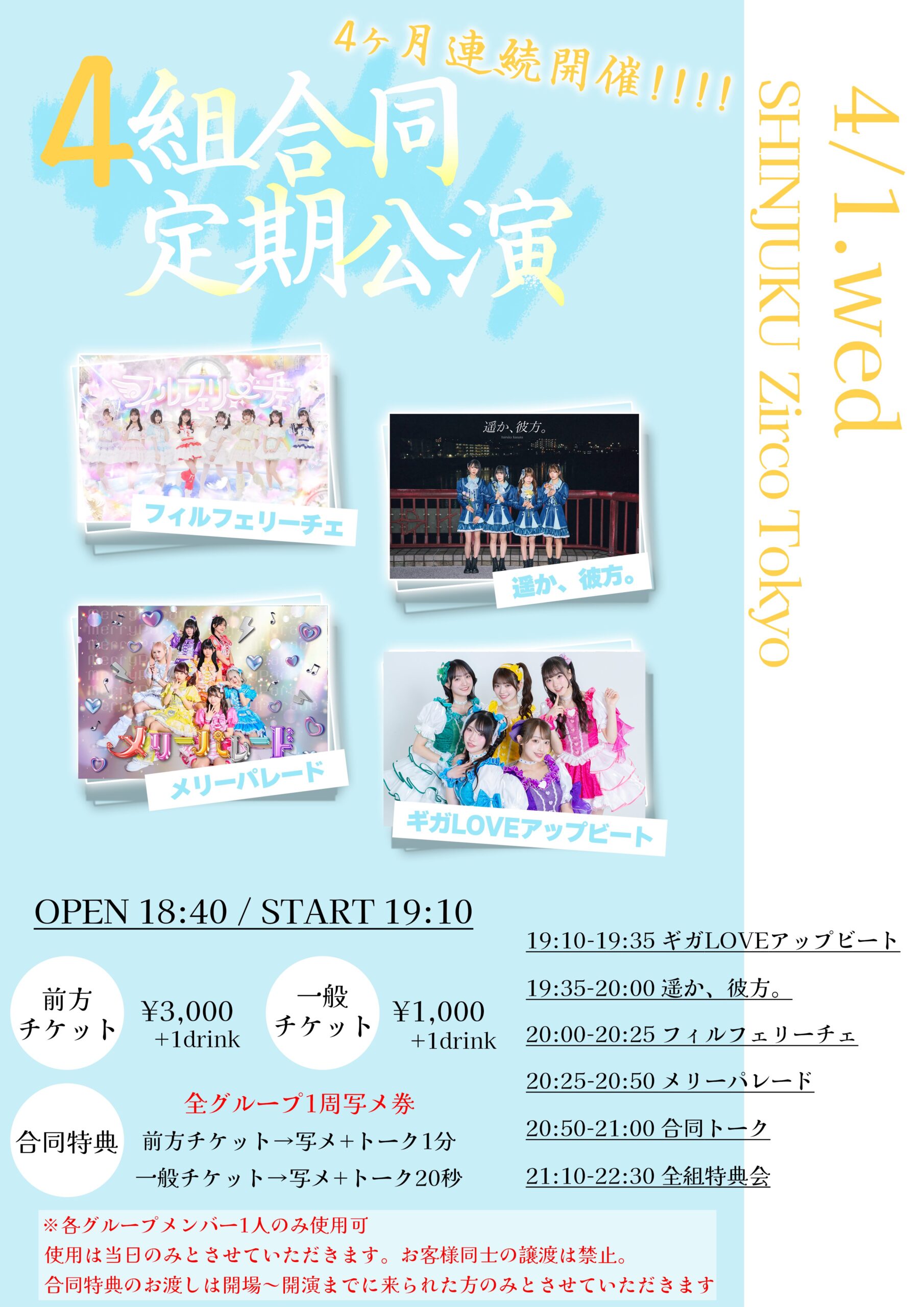 04.01(Wed) 4組合同定期公演 新宿 Zirco Tokyo X Facebook LINE コピー 2026.03.14 ACT ギガLOVEアップビート/遥か、彼方。/フィルフェリーチェ/メリーパレード イベント詳細 Zirco Tokyo|東京 新宿歌舞伎町のライブハウス新宿のライブハウス『Zirco Tokyo』ベースオントップグループ9軒目のライブハウスです。