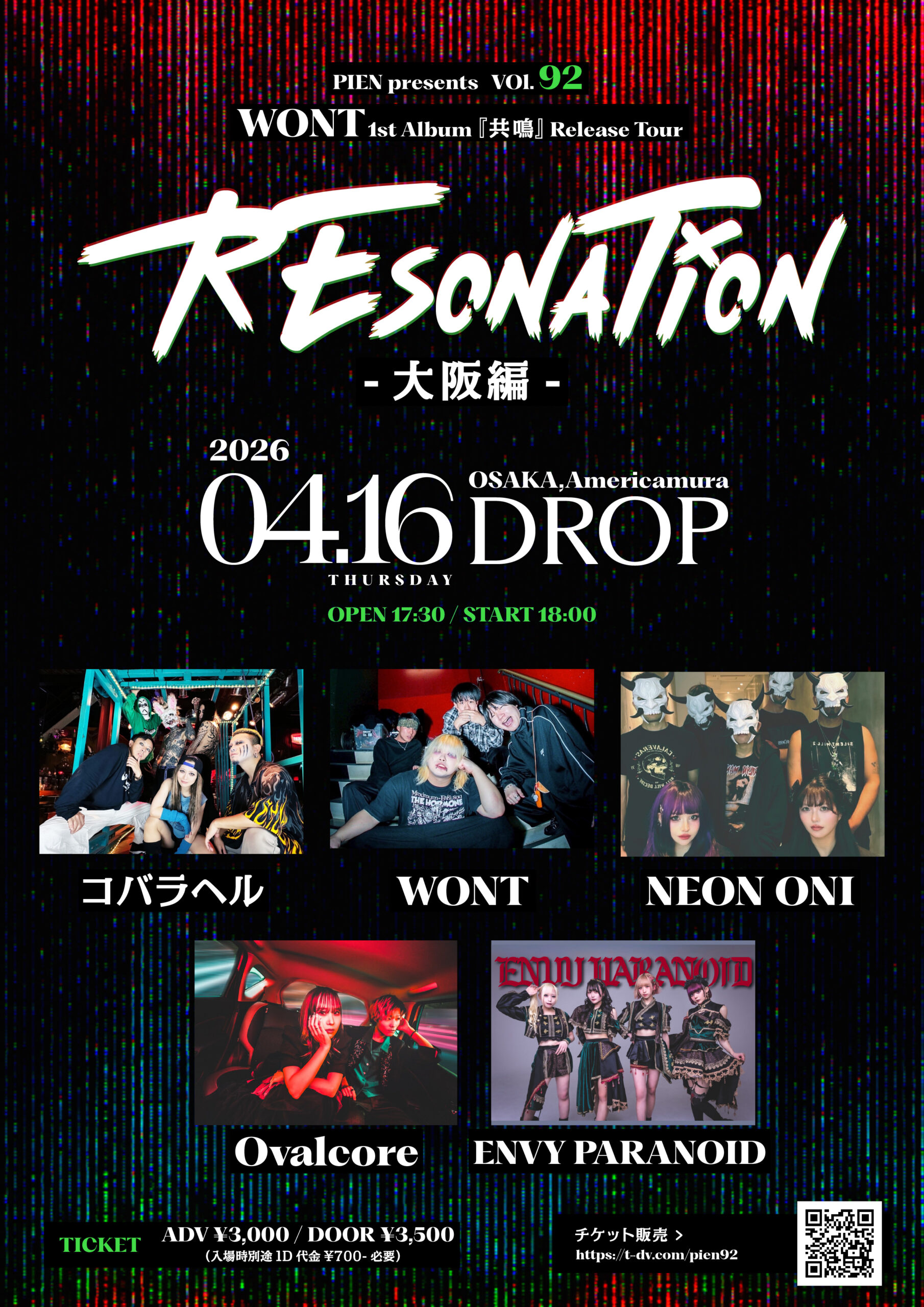 04.16(Thu) PIEN presents VOl.92 WONT 1st Album 『共鳴』Release Tour “RESONATION” – 大阪編 – アメリカ村DROP X Facebook LINE コピー 2026.03.18 ACT WONT / コバラヘル / NEON ONI / Ovalcore / ENVY PARANOID イベント詳細 アメリカ村 DROP(ドロップ)|大阪 心斎橋アメ村のライブハウスベースオントップグループのライブハウス『アメリカ村 DROP(ドロップ)』大阪アメリカ村の中心地にあるライブハウスです。