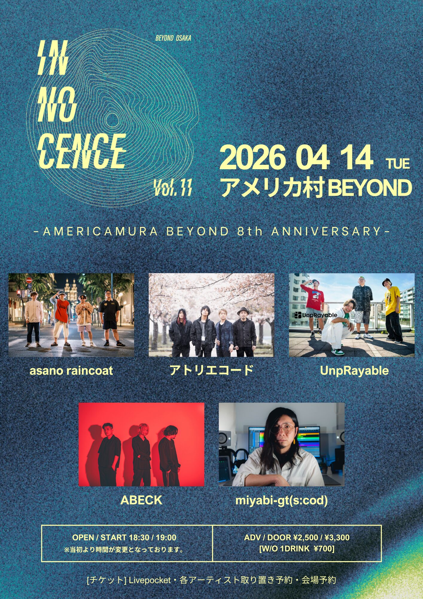 04.14(Tue) INNOCENCE vol.11 -アメリカ村 BEYOND 8th ANNIVERSARY- アメリカ村BEYOND X Facebook LINE コピー 2026.03.18 ACT asano raincoat / アトリエコード / UnpRayable / ABECK / miyabi-gt(s:cod) イベント詳細 アメリカ村 BEYONDベースオントップグループのライブハウス『アメリカ村 BEYOND(ビヨンド)』大阪アメリカ村の中心地にあるライブハウスです。