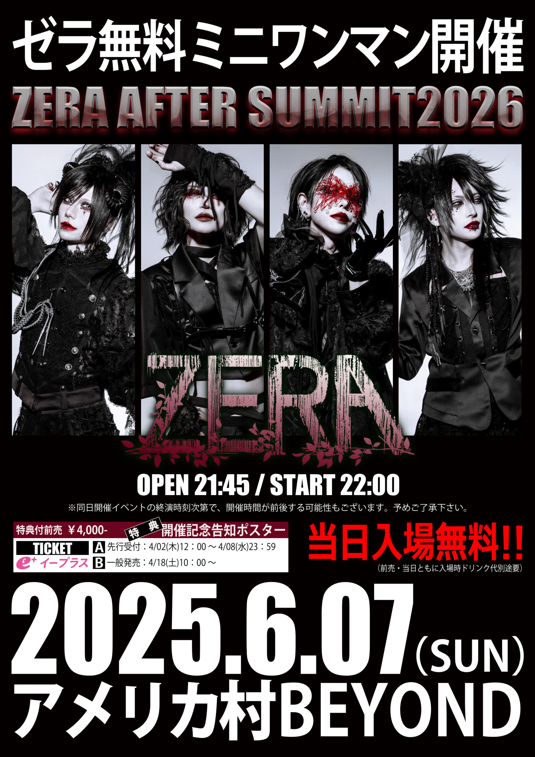 06.07(Sun) ゼラ無料ミニワンマン『ZERA AFTER SUMMIT2026』 アメリカ村BEYOND X Facebook LINE コピー 2026.03.18 ACT ゼラ イベント詳細 アメリカ村 BEYONDベースオントップグループのライブハウス『アメリカ村 BEYOND(ビヨンド)』大阪アメリカ村の中心地にあるライブハウスです。