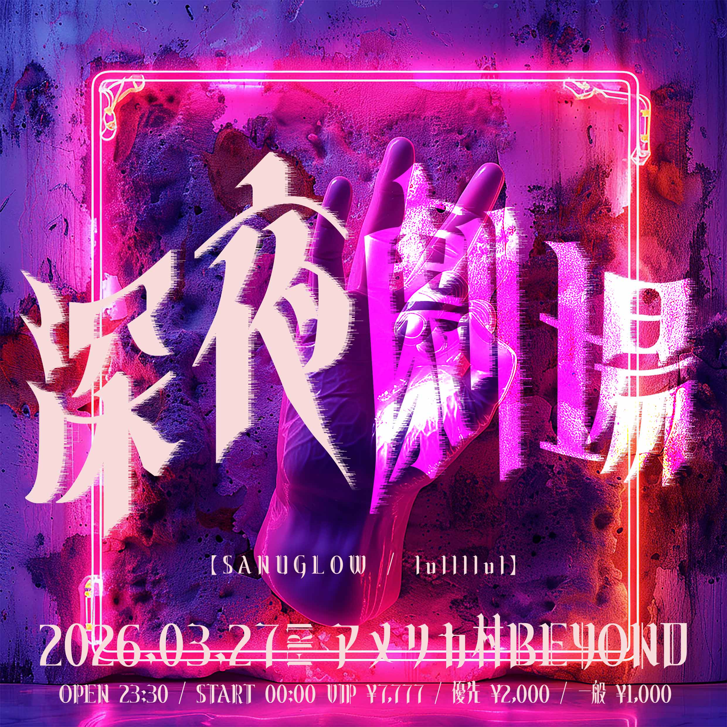 03.27(Fri) 深夜劇場 アメリカ村BEYOND X Facebook LINE コピー 2026.03.19 ACT SANUGLOW / lullllul イベント詳細 アメリカ村 BEYONDベースオントップグループのライブハウス『アメリカ村 BEYOND(ビヨンド)』大阪アメリカ村の中心地にあるライブハウスです。