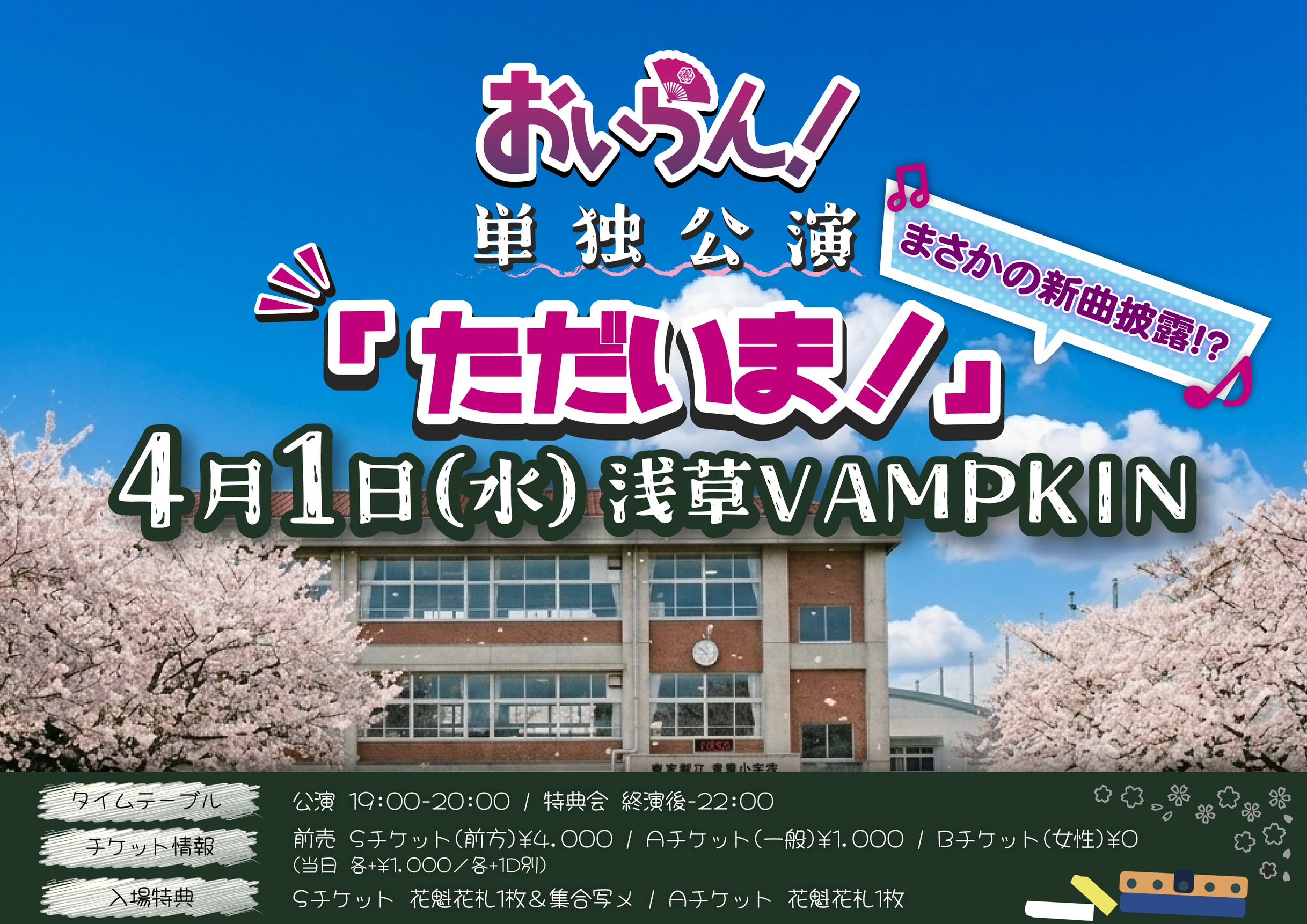 04.01(Wed) おいらん!単独公演 「ただいま!」 浅草VAMPKIN X Facebook LINE コピー 2026.03.19 ACT おいらん! イベント詳細 浅草 VAMPKINベースオントップグループのライブハウス『浅草 VAMPKIN(アサクサ ヴァンプキン)』東京浅草にあるライブハウスです。