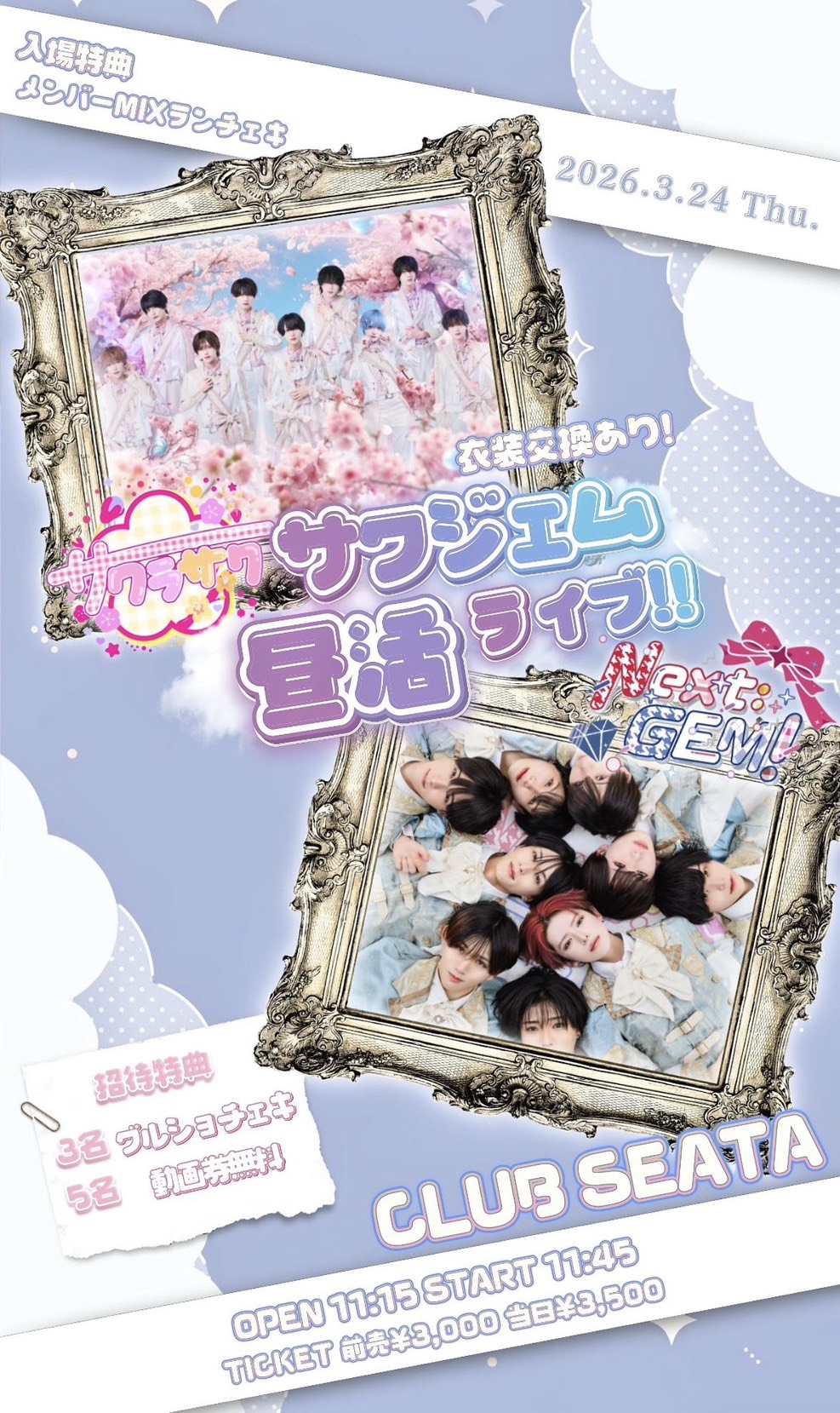 03.24(Tue) サクジェム昼活ライブ!! 吉祥寺 CLUB SEATA X Facebook LINE コピー 2026.03.21 ACT Next:GEM! サクラサク イベント詳細 吉祥寺CLUB SEATA|東京 吉祥寺のライブハウス吉祥寺駅から徒歩5分、西東京最大級のライブハウス/CLUB!誰もが想像し得なかった吉祥寺という場所に新たなプレイスポットが誕生!都内のライブシーン・クラブシーンに新たな風を創るCLUB SEATA