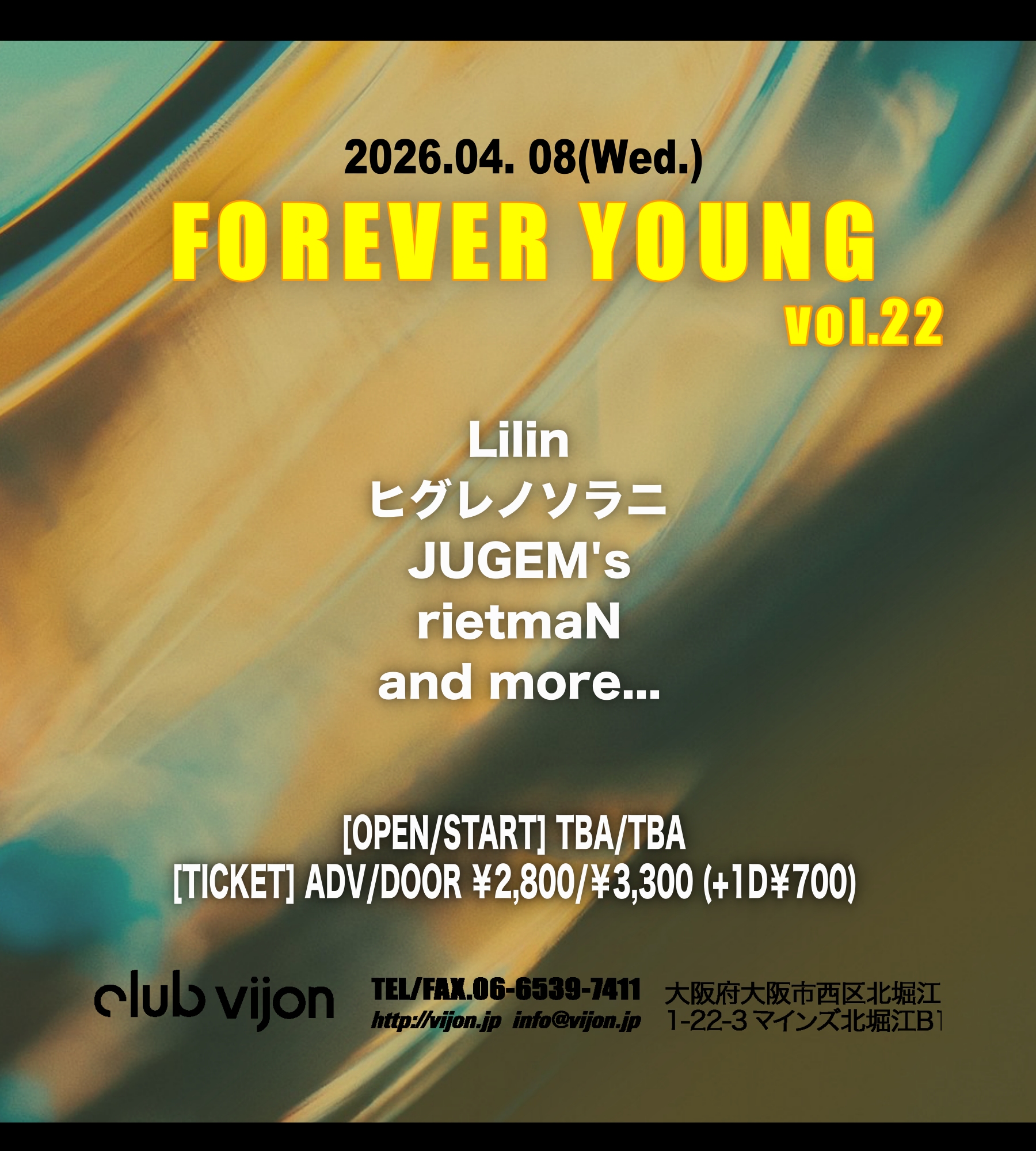 04.08(Wed) 【FOREVER YOUNG】vol.22 北堀江 club vijon X Facebook LINE コピー 2026.03.25 ACT Lilin / ヒグレノソラニ / JUGEM’s / rietmaN / and more… イベント詳細 北堀江 club vijon(クラブビジョン)|大阪 北堀江のライブハウスベースオントップグループのライブハウス『北堀江club vijon』大阪北堀江にあるライブハウスです。