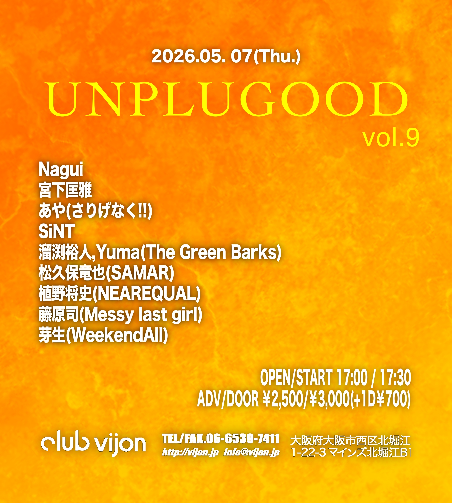北堀江 club vijonNagui / 宮下匡雅 / あや(さりげなく!!) / SiNT / 溜渕裕人,Yuma(The Green Barks) / 松久保竜也(SAMAR) / 植野将史(NEAREQUAL) / 藤原司(Messy last girl) / 芽生(WeekendAll)