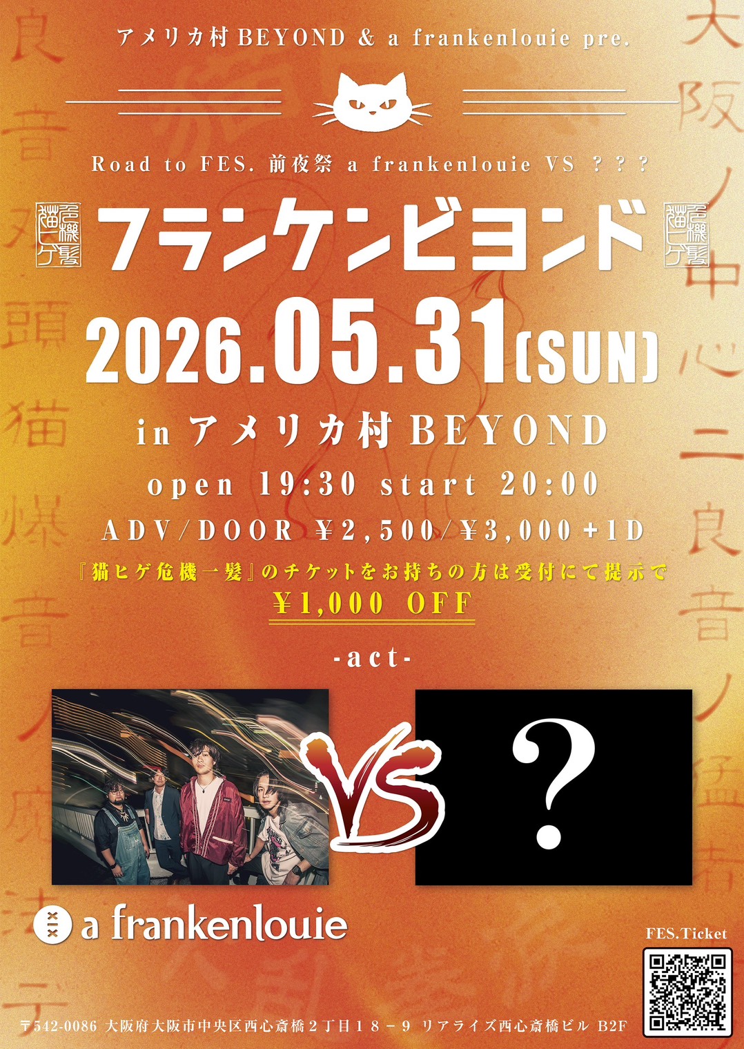05.31(Sun) a frankenlouie pre.Road to FES企画 「フランケンビヨンド」~猫ヒゲ危機一髪前夜祭 a frankenlouie VS 〇〇~(仮) アメリカ村BEYOND X Facebook LINE コピー 2026.03.25 ACT a frankenlouie / 〇〇〇() イベント詳細 アメリカ村 BEYONDベースオントップグループのライブハウス『アメリカ村 BEYOND(ビヨンド)』大阪アメリカ村の中心地にあるライブハウスです。