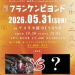 05.31(Sun) a frankenlouie pre.Road to FES企画 「フランケンビヨンド」~猫ヒゲ危機一髪前夜祭 a frankenlouie VS Lailah~ アメリカ村BEYOND X Facebook LINE コピー 2026.03.25 ACT a frankenlouie / Lailah イベント詳細 アメリカ村 BEYONDベースオントップグループのライブハウス『アメリカ村 BEYOND(ビヨンド)』大阪アメリカ村の中心地にあるライブハウスです。