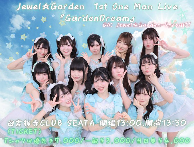 03.29(Sun) Jewel☆Garden 1st One Man Live『GardenDream』 吉祥寺 CLUB SEATA X Facebook LINE コピー 2026.03.25 ACT Jewel☆Garden イベント詳細 吉祥寺CLUB SEATA|東京 吉祥寺のライブハウス吉祥寺駅から徒歩5分、西東京最大級のライブハウス/CLUB!誰もが想像し得なかった吉祥寺という場所に新たなプレイスポットが誕生!都内のライブシーン・クラブシーンに新たな風を創るCLUB SEATA
