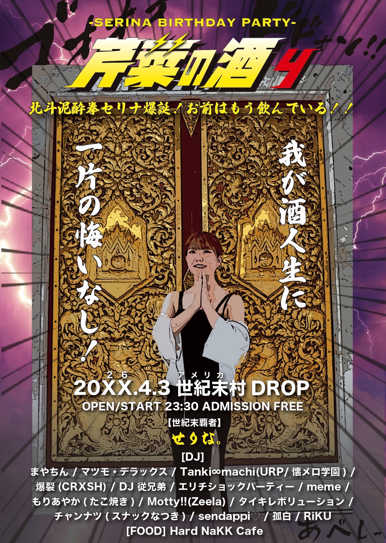 <世紀末救世主> せりな。(芹菜の酒) <DJ’s> まやちん / マツモ・デラックス / Tanki∞machi(URP/懐メロ学園) / 爆裂(CRXSH) / DJ 従兄弟 / エリチショックパーティー / meme / もりあやか(たこ焼き) / Motty!!(Zeela) / タイキレボリューション / チャンナツ(スナックなつき) / sendappi♡ / 孤白 / RiKU <FOOD> HARD NaKK CAFE