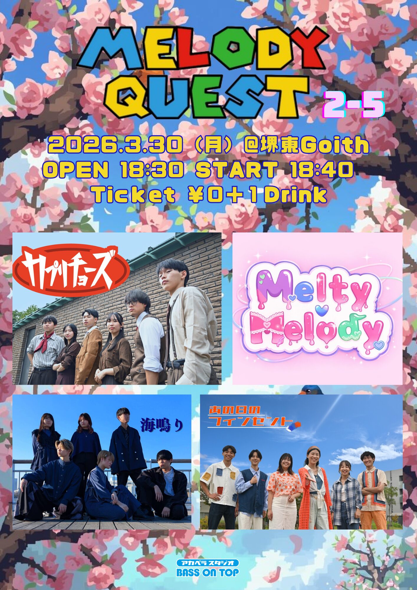 03.30(Mon) アカペラスタジオBASS ON TOP presents. Melody Quest vol.2-5 堺東Goith X Facebook LINE コピー 2026.03.27 ACT あの日のフィセント / 海鳴り / Melty♡Melody / カプリチョーズ イベント詳細 堺東 Goith(ゴイス)|大阪 堺東のライブハウスベースオントップグループのライブハウス『堺東Goith』南海高野線の堺東からすぐの、粋なライブハウスです。