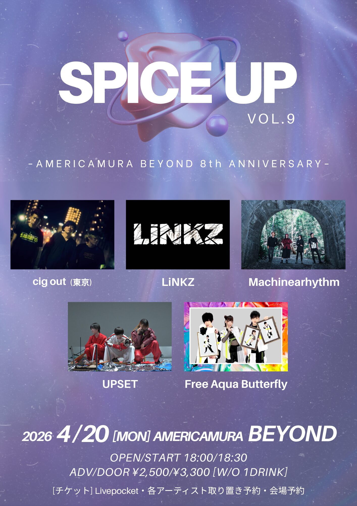 04.20(Mon) SPICE UP vol.9 -アメリカ村 BEYOND 8th ANNIVERSARY- アメリカ村BEYOND X Facebook LINE コピー 2026.03.27 ACT cig out (東京) / LiNKZ / Machinearhythm / UPSET / Free Aqua Butterfly イベント詳細 アメリカ村 BEYONDベースオントップグループのライブハウス『アメリカ村 BEYOND(ビヨンド)』大阪アメリカ村の中心地にあるライブハウスです。