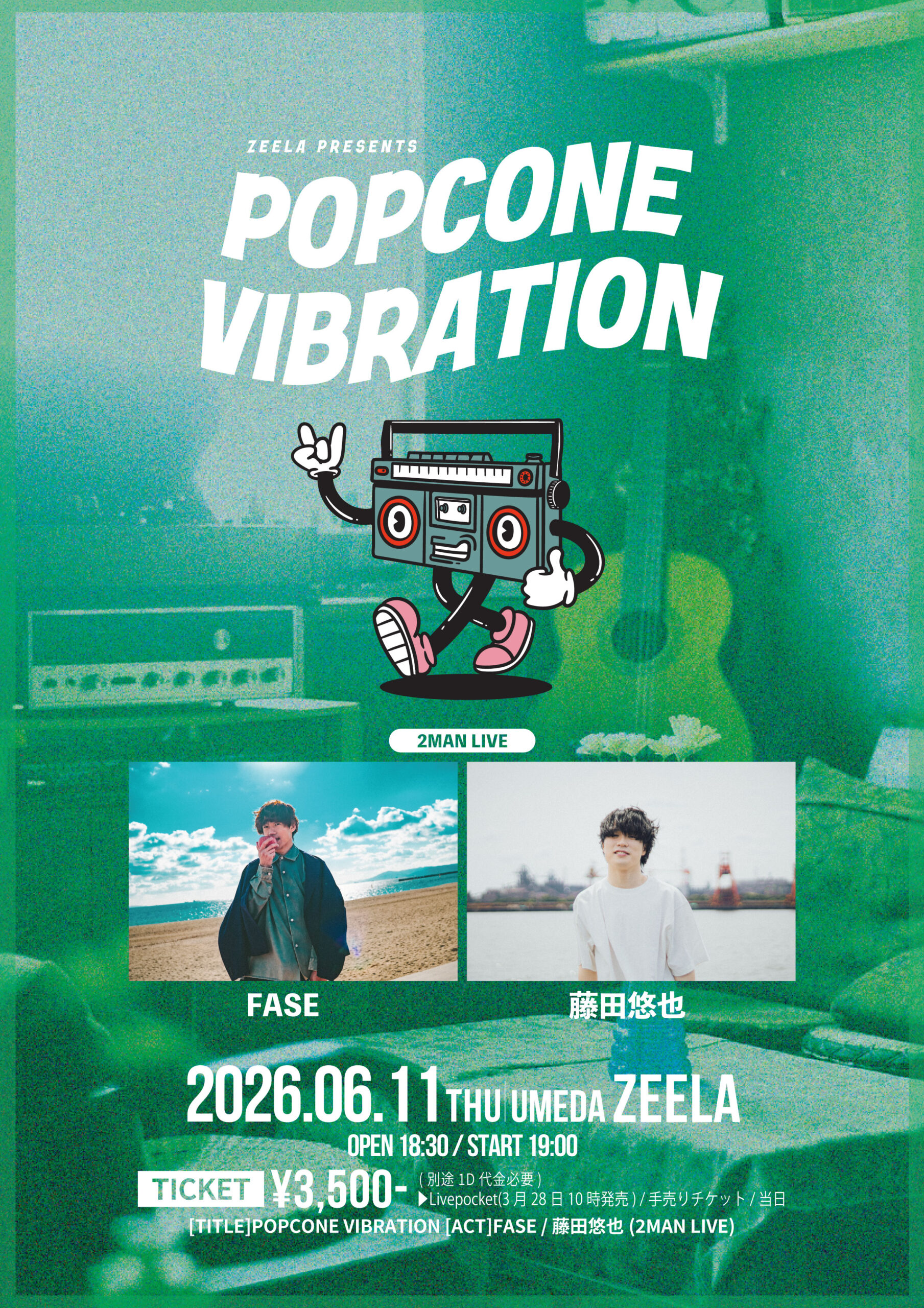 06.11(Thu) Zeela presents.POPCONE VIBRATION 梅田Zeela X Facebook LINE コピー 2026.04.02 ACT FASE / 藤田悠也 イベント詳細 梅田 Zeela|大阪 梅田のライブハウス大阪梅田のライブハウス Zeela(ジーラ)!ベースオントップグループ8軒目となるライブハウスです。