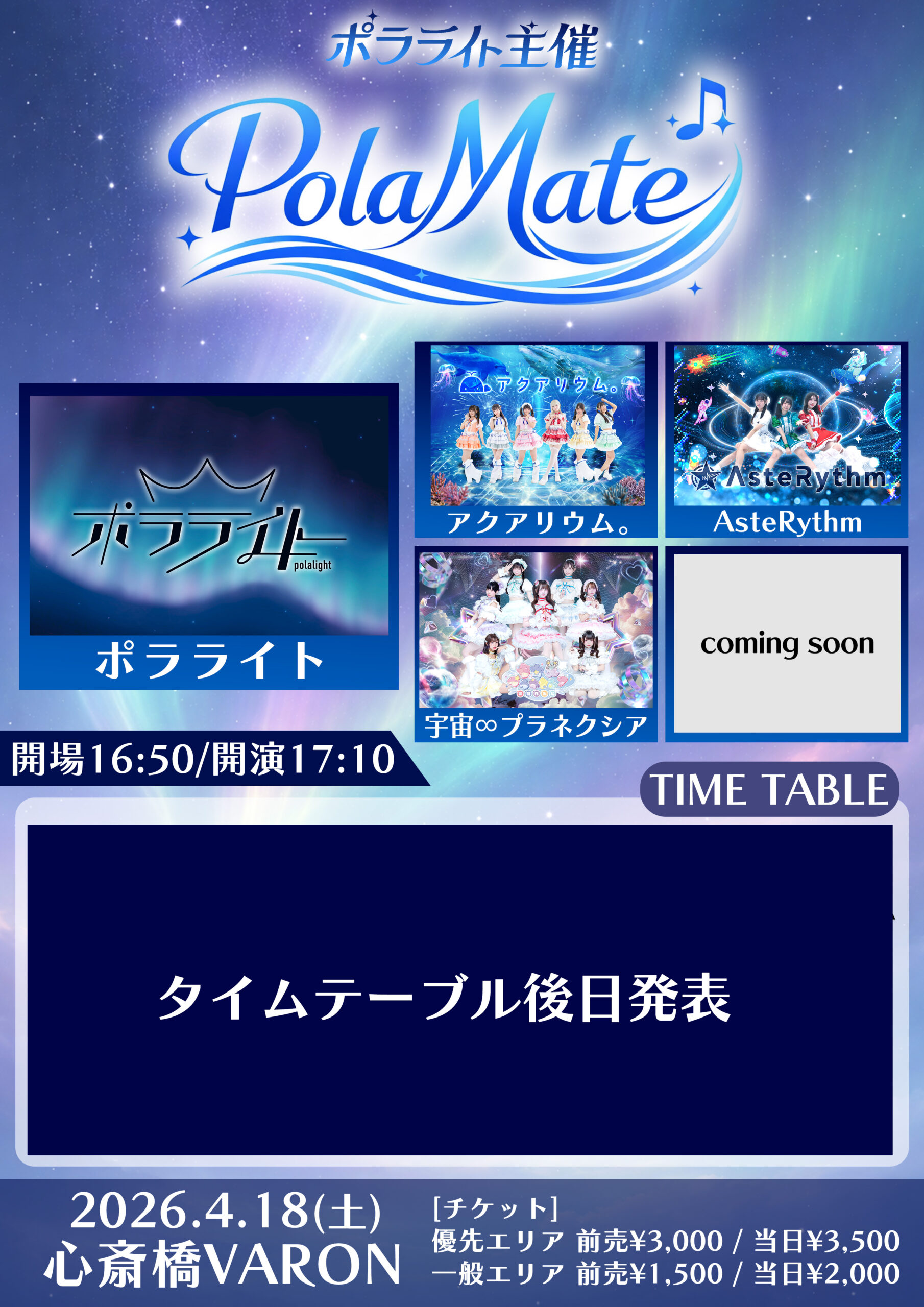 04.18(Sat) 【ポラライト主催公演「Polamate」】 心斎橋VARON X Facebook LINE コピー 2026.04.01 ACT アクアリウム。/AsteRythm/宇宙∞プラネクシア/ポラライトetc イベント詳細 心斎橋 VARON(ヴァロン)|大阪 心斎橋のライブハウス大阪にあるライブハウス「心斎橋VARON」アーティストのパフォーマンスを最大限に引き出すことをコンセプトにしたステージ・音響・照明。ジャンルや形態を超え、様々なイベントに完全対応いたします。音楽スタジオベースオントップ併設。