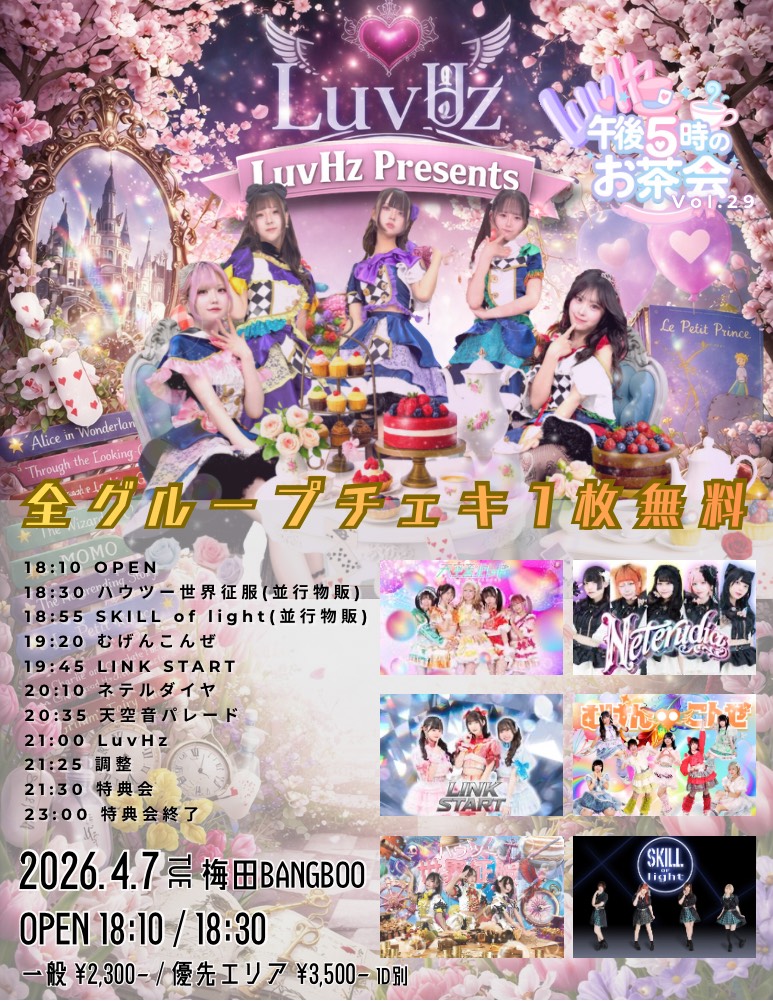 04.07(Tue) LuvHz Pre.午後5時のお茶会 Vol.29 梅田BANGBOO X Facebook LINE コピー 2026.04.02 ACT LuvHz/ハウツー世界征服/ネテルダイヤ/SKILL of light/天空音パレード/むげんこんぜ/LINK START イベント詳細 梅田 BANGBOOベースオントップグループのライブハウス『梅田 BANGBOO(ウメダバンブー)』大阪梅田にあるライブハウスです。