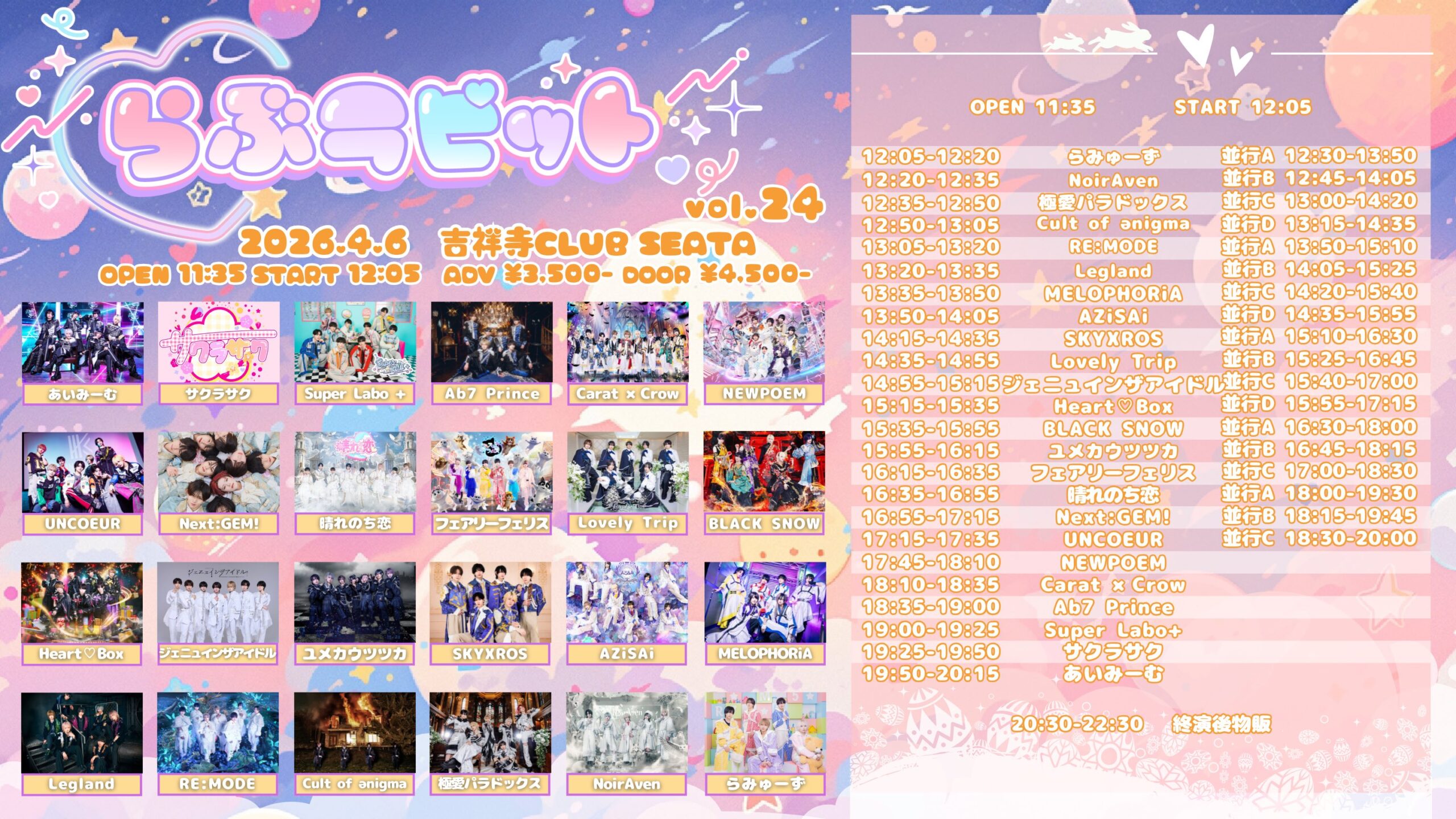あいみーむ Super Labo + Ab7 Prince 晴れのち恋 UNCOEUR Next:GEM! BLACK SNOW MELOPHORiA Cult of enigma RE:MODE AZiSAi らみゅーず サクラサク Carat×Crow NEWPOEM フェアリーフェリス ユメカウツツカ Heart❤︎Box ジェニュインザアイドル Lovely Trip SKYXROS Legland 極愛パラドックス NoirAven