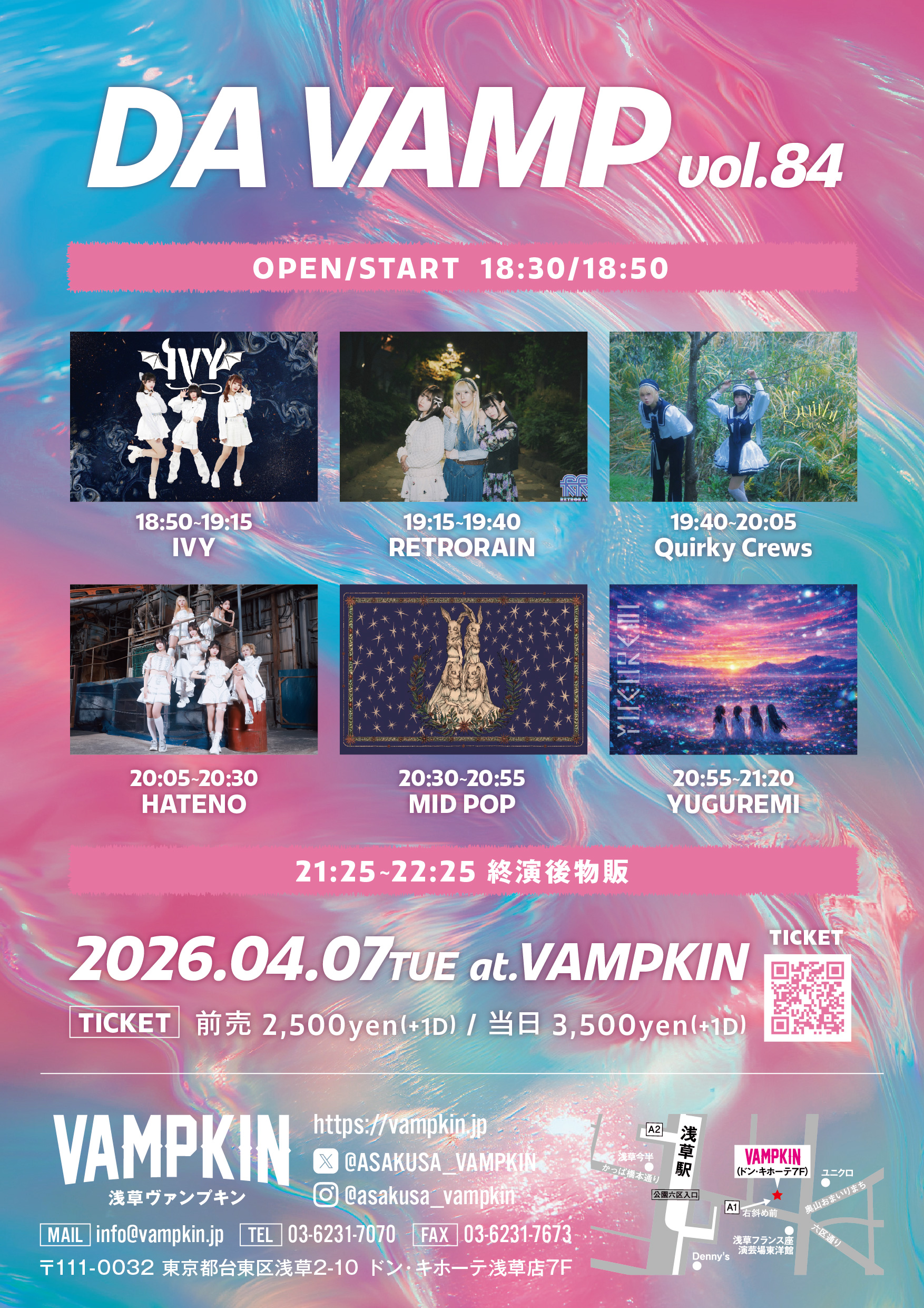 04.07(Tue) DA VAMP Vol.84 浅草VAMPKIN X Facebook LINE コピー 2026.04.03 ACT IVY / RETRORAIN / Quirky Crews / HATENO / MID POP / YUGUREMI イベント詳細 浅草 VAMPKINベースオントップグループのライブハウス『浅草 VAMPKIN(アサクサ ヴァンプキン)』東京浅草にあるライブハウスです。