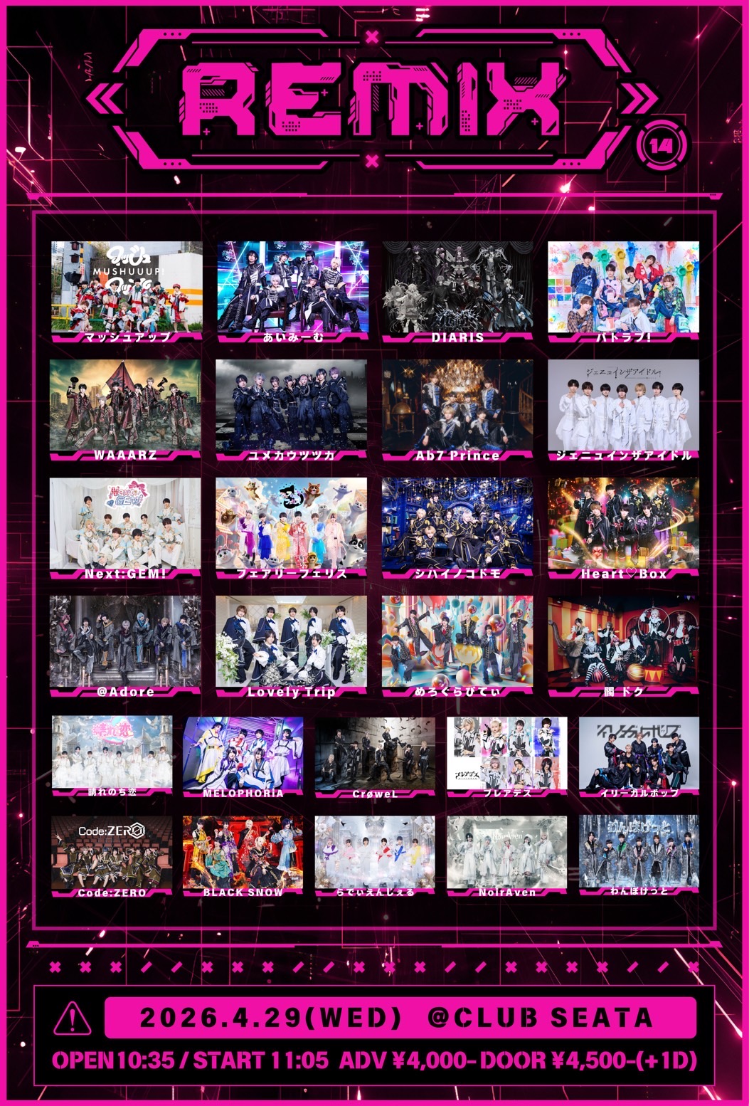 吉祥寺 CLUB SEATAイリーガルポップ わんぽけっと WAAARZ Ab7 Prince ユメカウツツカ プレアデス @Adore らでぃえんじぇる シハイノコドモ マッシュアップ あいみーむ DIARIS バトラブ! ジェニュインザアイドル Next:GEM! フェアリーフェリス Lovely Trip めろぐらびてぃ 髑 晴れのち恋 MELOPHORiA CroweL Code:ZERO BLACK SNOW NoirAven