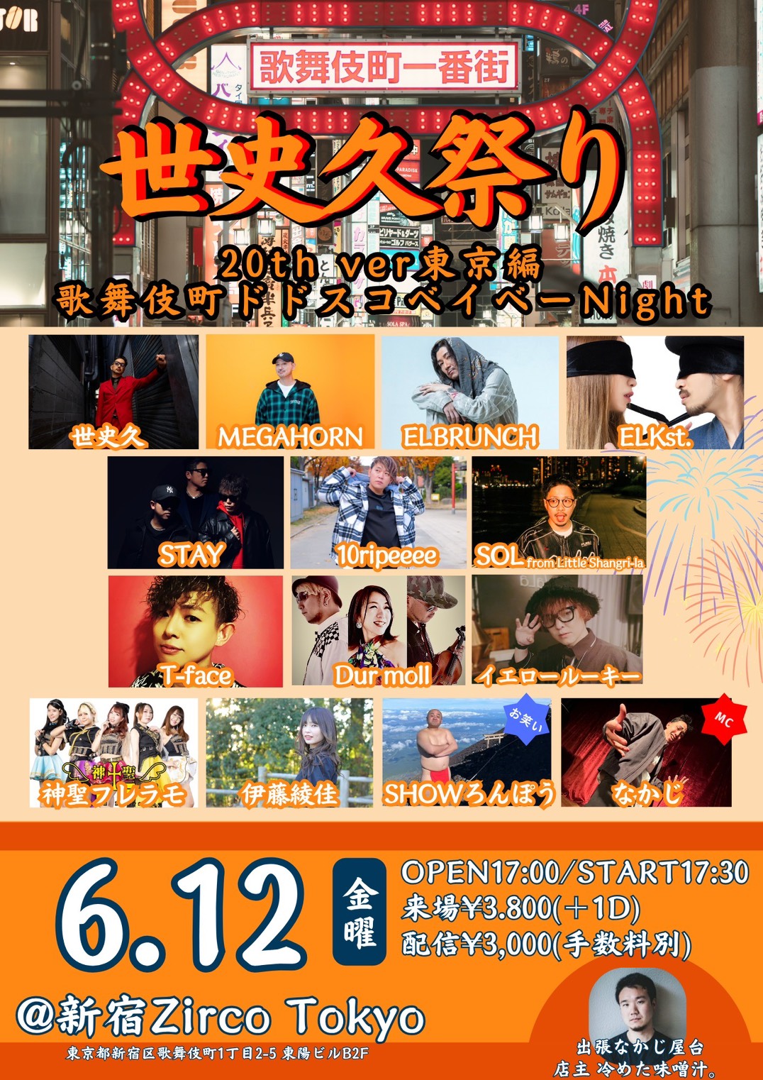 新宿 Zirco Tokyo世史久 / MEGAHORN / ELBRUNCH / ELKst. / STAY / SOL from Little Shangri-la / 神聖フレラモ / 10ripeeee / Dur moll / T-face / イエロールーキー / 伊藤綾佳 / SHOWろんぽう(お笑いと他) / 冷めた味噌汁(出張なかじ屋台) / なかじ(MCや色々)