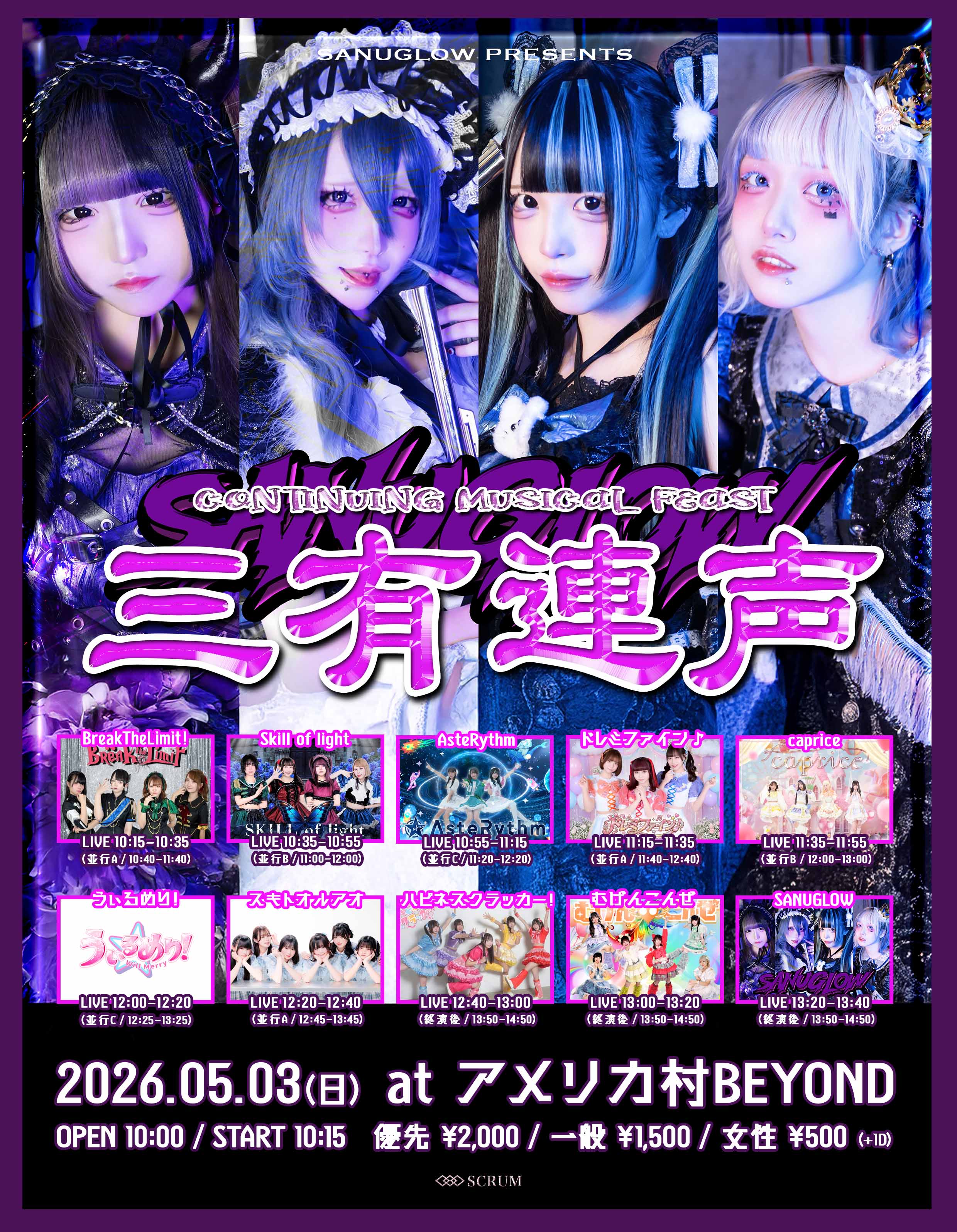 アメリカ村BEYONDむげんこんぜ / SANUGLOW / BreakTheLimit!/ ドレミファイン♪ / caprice / うぃるめり!/ ハピネスクラッカー! / AsteRythm / Skill of light / スキトオルアオ